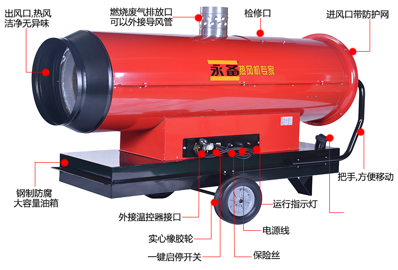 1.柴油或煤油用作燃料。燃燒產(chǎn)生的熱量由熱風機后部的強力風扇排出。采用清潔燃燒技術,充分燃燒燃料,減少有害物質
